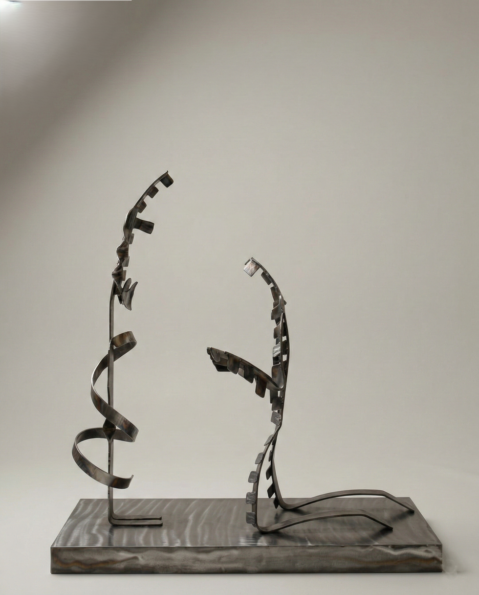 The piece depicts two abstract human figures constructed through curved mild steel ribs that define the body's volume without revealing identity or anatomical detail. The composition represents a moment of tension and suffering.
